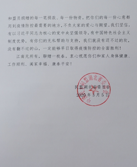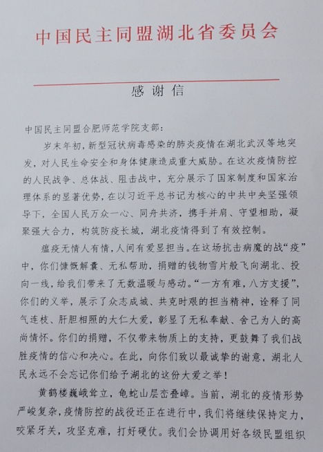 本网讯 瘟疫无情人有情,人间有爱显担当。近日,民盟湖北省委专门给我院民盟支部发来感谢信,感谢我院民盟支部在湖北疫情严峻时期的大爱之举。