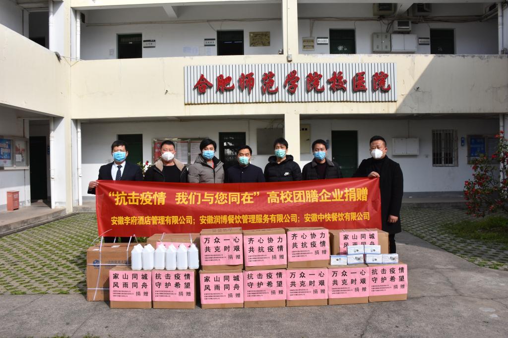 3月10日,多家爱心企业纷纷伸出援助之手,捐献了一批紧缺防疫物资。我院餐饮服务企业——安徽李府酒店管理有限公司、安徽润博餐饮管理服务有限公司、安徽中快餐饮有限公司联合捐赠德国进口额温枪6把、一次性医用口罩3000个、75%酒精6桶、84消毒液30桶、消毒喷壶80只。