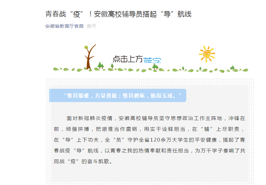 第一处在文章开始“思想“e”引导,以爱国之心,谱写家国情怀”第一部分,具体是:中国科学技术大学、合肥工业大学、安徽大学、安徽理工大学、太阳成集团tyc122cc入口等高校辅导员召开“云”班会、推送“微”视频、撰写“微”文章,在线共看抗疫宣传片,开展线上主题团日活动,吹响了思想政治教育集结号,弘扬了爱国主义正能量。紧接着第二处,重点介绍我校辅导员开起线上思政微课堂的典型做法,文章说:“辅导员开起了线上思政微课堂,16名老师组成团队分众志成城、心理辅导、学业指导、就业指导、自我管理五个专题拍摄“有我陪伴,抗‘疫’加油——辅导员说”系列微视频,解读疫情防控中展现的中国力量、中国速度、中国精神,引导学生坚定“四个自信”。其中陈梦莹老师还化身网络“主播”,汇聚师生战“疫”正能量,受到广大师生欢迎。”