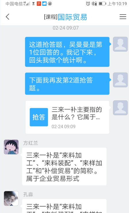 《国际贸易》课程的线上教学,是采用“直播+录播+MOOC慕课+学生自学”混合式教学模式来进行的,并采用了多元化手段来助力线上教学效果。学生每次开课前,我会将此次课程内容提前放在平台以便学生“预习”。开课时,会以平台“通知”的方式告知学生此堂课的学习任务,以便学生明确学习目标。同时,通过“学习通”签到打卡,以掌握学生的到课情况。开课中,会以直播点名提问、录播教学视频中随机设立讨论题要求学生在讨论区回答及小节测试等手段,来掌控学生的学习状态。课后,会以要求学生定期完成平台作业的形式,来及时了解学生知识掌握的薄弱点,以便下节课有针对性的加强学习。