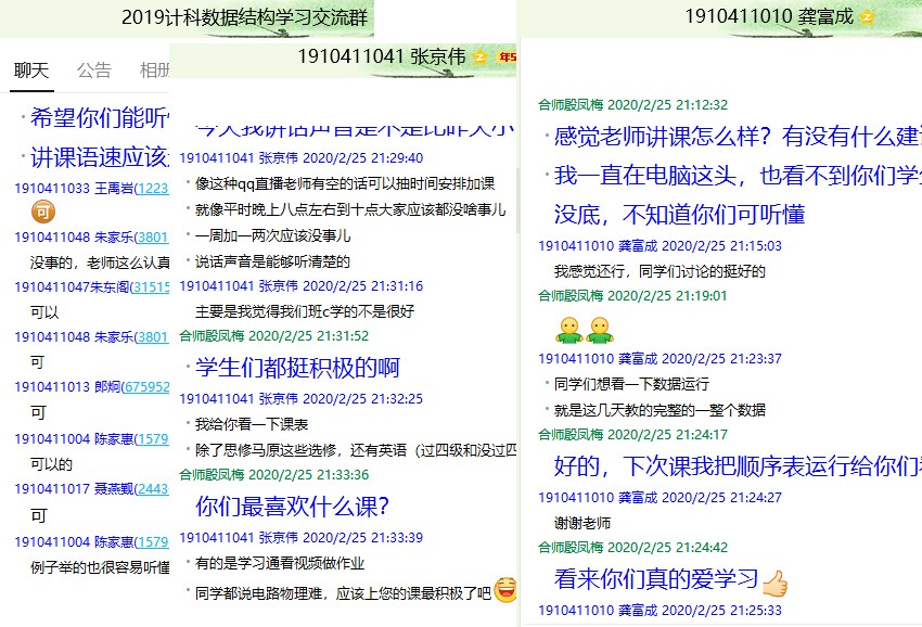线下教学时教师可以通过观察学生的反应,实时了解学生的掌握情况,而线上教学则有一定局限。为此,每节课后我都会回看录制的直播视频,发现教学中存在的不足,并及时通过QQ群向学生了解课堂教学效果,征求在线教学的建议,以便更好地开展在线教学。另外,针对教学中出现的共性问题,课程组全体教师也会及时讨论、集思广益,找出更好的解决方法。