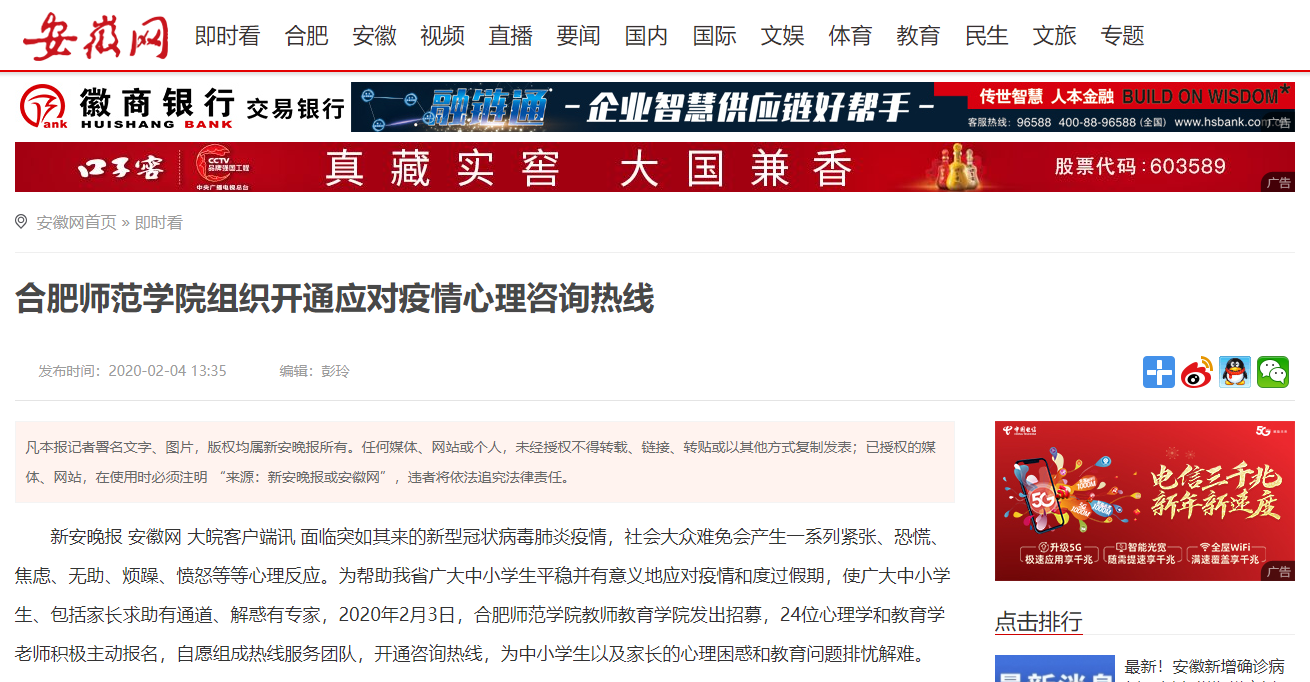 此前,学校与安徽省教育学会合作编写了“安徽省中小学生应对新型冠状病毒肺炎疫情心理自助指南”,为配合“指南”具体开展心理咨询工作,太阳成集团tyc122cc入口副院长、教育部中小学心理健康教育指导委员会委员姚本先教授亲自协调和指导,并直接参与热线咨询工作。咨询和辅导形式主要通过电话和在线咨询进行,具体时间为每天上午9:00—12:00,下午2:00—5:00,晚上7:30—9:00。