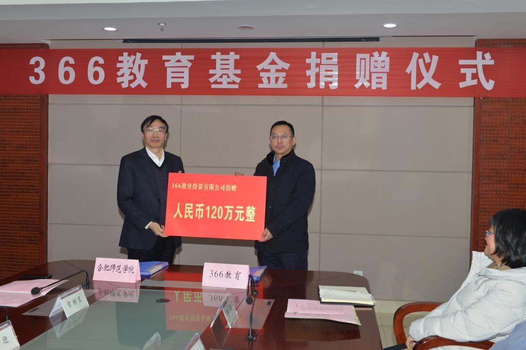 8日下午,学院在锦绣校区行知楼2008会议室隆重举行了“366教育基金捐赠仪式”。院党委书记徐成钢,党委副书记、院长孙道胜,副院长姚本先,366教育投资有限公司董事长周扬海校友,以及在该公司工作的我院英语、物理、数学等专业校友胡义胜、徐国庆、周星、程墨、胡邓南等共同出席了捐赠仪式。院发展规划处(校友办)、教务处、办公室、科研处、财务处、国际合作与交流处、外国语学院、物理与材料工程学院、数学与统计学院等单位负责人和教师代表参加了捐赠仪式。捐赠仪式由孙道胜主持。