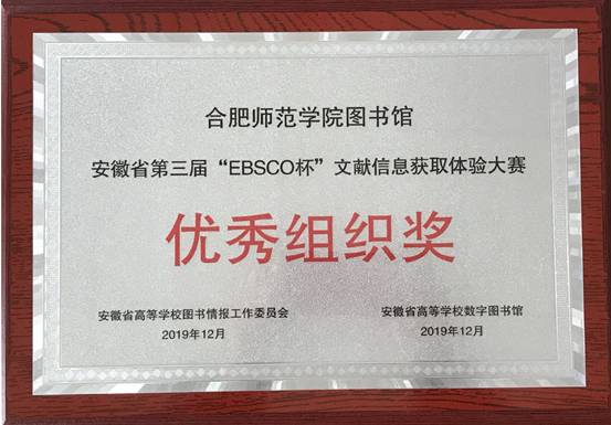 在安徽省第三届“EBSCO杯”文献信息获取体验大赛中,我院陈羽艳、陈书舟同学获评一等奖,张千娇、胡文慧、朱海燕、陈梦莲、王锡滢、陈莹娣等同学获评二等奖,刘柳同学获评三等奖。我院图书馆也因为出色地组织学生完成赛事工作,荣获“优秀组织奖”。