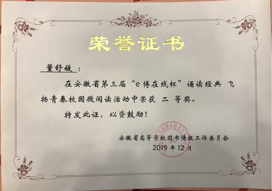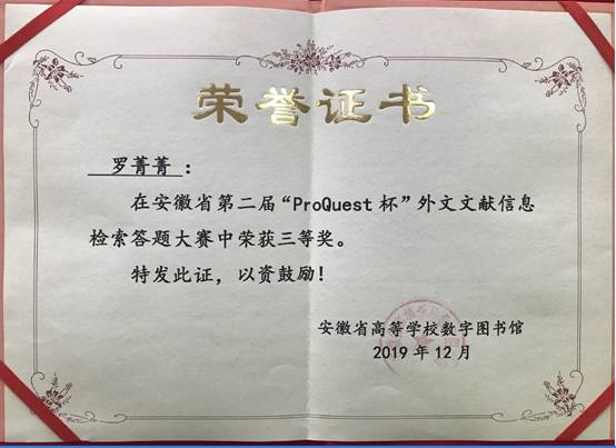 本网讯 为提升大学生信息素养,丰富大学生文化生活,近日,学院图书馆积极组织学生参加安徽省第三届“e博在线杯”微阅读主题创作活动及第二届“ProQuest杯”外文文献信息检索答题大赛等活动,均收获了优异成绩。