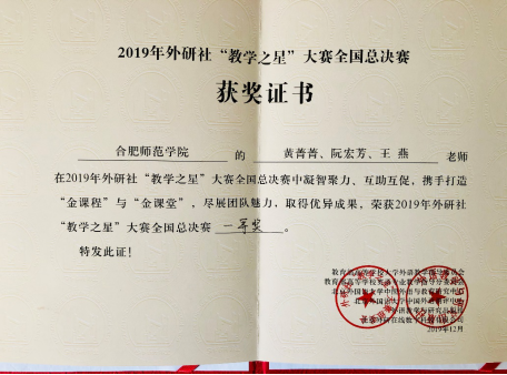 本网讯 2019年外研社“教学之星”大赛全国总决赛于12月10日至13日在北京隆重举行。我院教师黄菁菁、阮宏芳和王燕组成的团队一路过关斩将,凭借思路清晰的教学设计,紧扣教学目标的课堂展示和有效的教学评价体系,继在全国复赛中和半决赛中分别获得特等奖后,最终在全国总决赛中再创佳绩,获得全国总决赛一等奖,并获得境外研修的奖励。这也是本年度安徽省所有参赛团队中的最好成绩。
