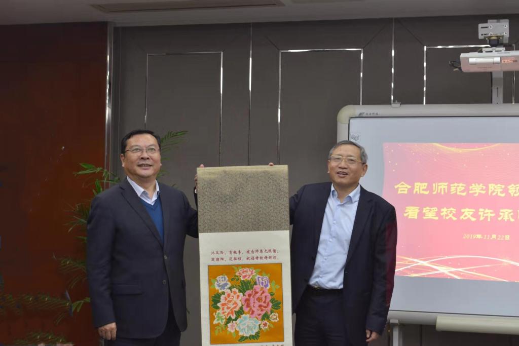 许承明对母校领导专程看望表示热烈欢迎和衷心感谢。他说见到母校领导,仿佛回到三十多年前,当年同学们刻苦学习,如饥似渴,只争朝夕。学校开门办学,聘请了中科大等一大批名师授课,为我们奠定了扎实的专业基础。看到母校如今的巨大变化,非常欣喜,愿为母校发展尽绵薄之力。为表达感恩和祝福,他还专门题诗“沐风雨,育桃李,感念师恩无限情;迎朝阳,迈征程,祝福母校铸辉煌”,并特制在南京云锦上赠送给母校。