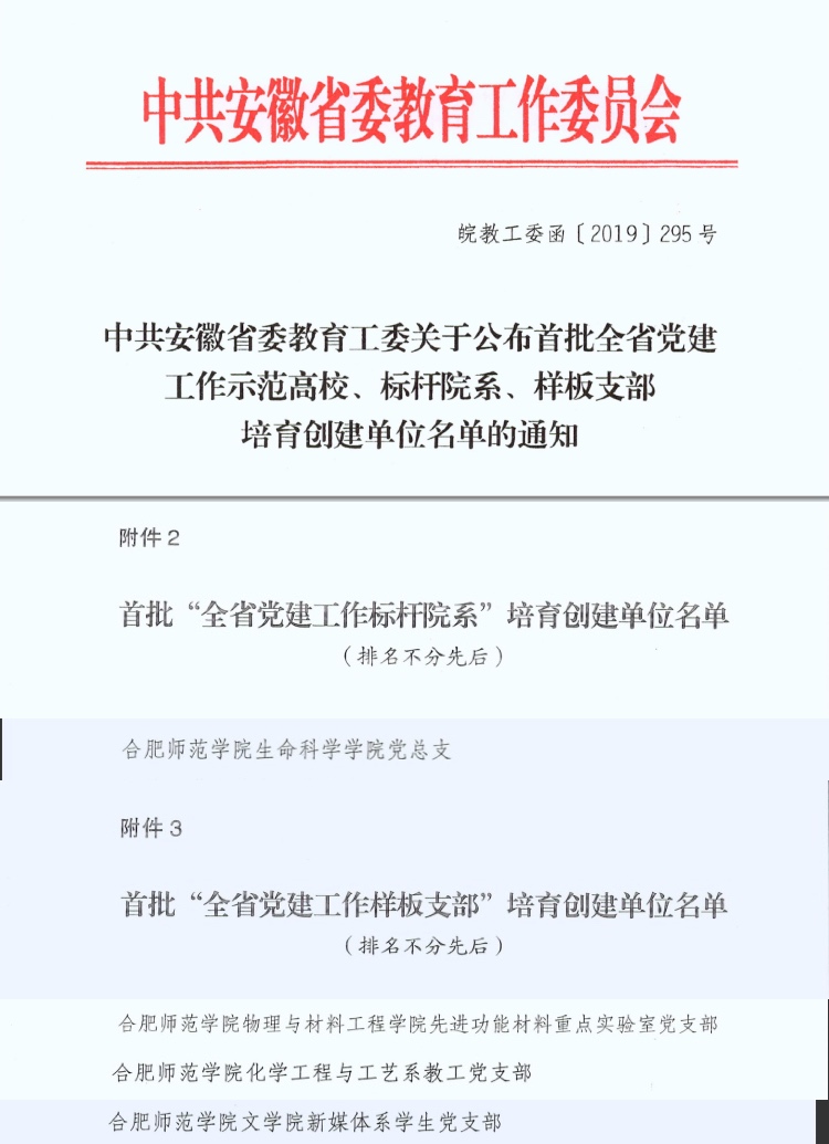 本网讯 近日,省委教育工委公布了首批全省党建工作示范校、标杆院系、样板支部培育创建单位名单,我院生命科学学院党总支荣获首批全省党建工作标杆院系培育创建单位,物理与材料工程学院先进功能材料重点实验室党支部、化学与化学工程学院化学工程与工艺系教工党支部、文学院新媒体系学生党支部荣获首批全省党建工作样板支部培育创建单位称号。入选数量位居全省同类高校前列。