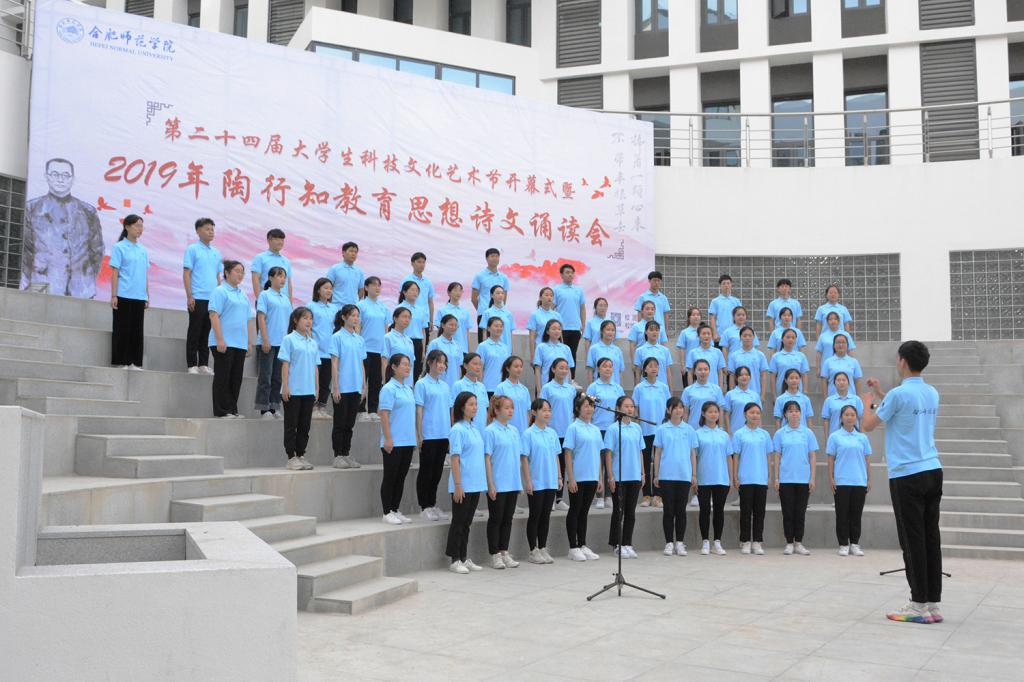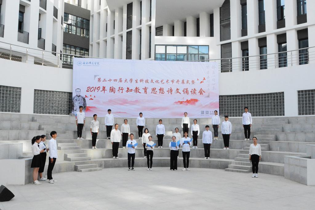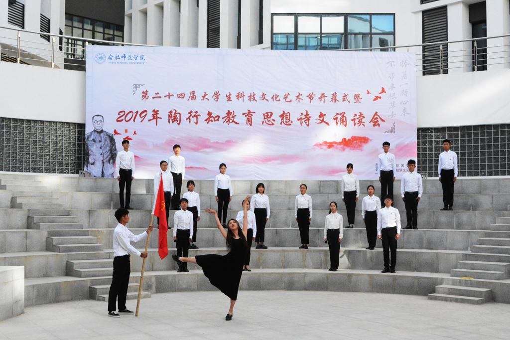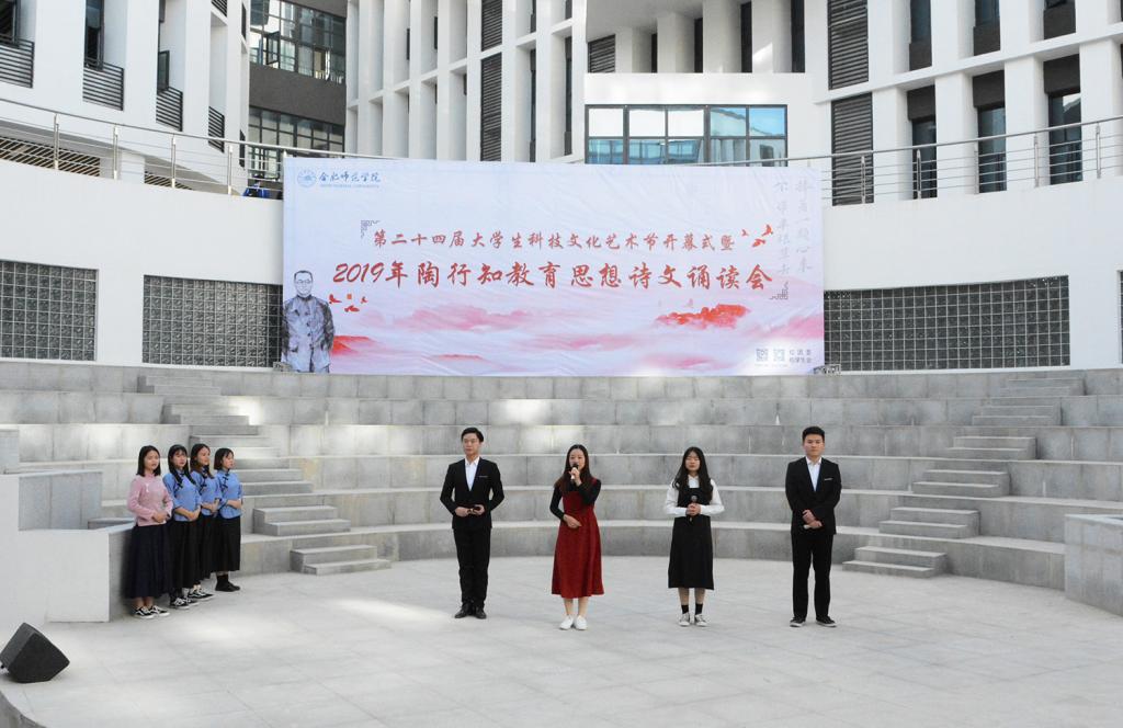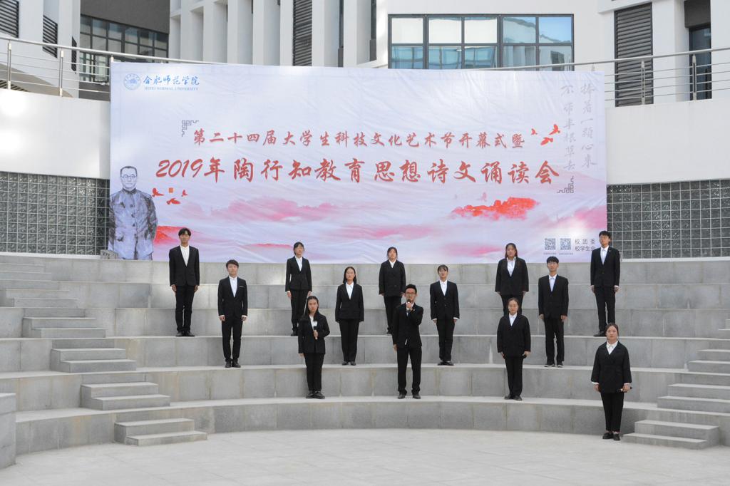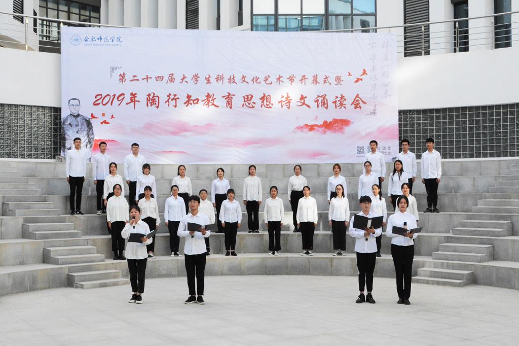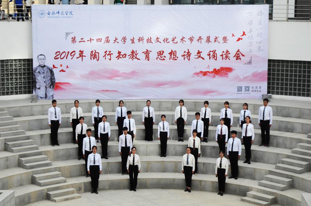 随后,陶行知教育思想诗文诵读会正式拉开帷幕。文学院声情并茂地朗诵了《知之始,行之成》,深情地歌颂了陶行知先生将毕生献给平民教育事业,矢志投身教育救国的爱国热情。经济与管理学院的《爱传经管,行知天下》慷慨激昂,并结合手语舞《感恩的心》,表达了合师学子在新时代传承行知精神、热爱伟大祖国的决心。电子信息与电气工程学院、数学与统计学院的《行知韵》声音铿锵富有感染力,让人仿佛穿越时空,听到了当年晓庄师范朗朗的读书声。生命科学学院、化学与化学工程学院的《师德馨香,春暖花开》声音悠扬动听,娓娓道来陶行知先生“甘为骆驼、乐育英才”的师德精神。艺术传媒学院、外国语学院、物理与材料工程学院、计算机学院的《行知中华,爱满天下》歌颂了陶行知先生作为伟大的人民教育家无保留地追随中国共产党,为劳苦大众能够接受平等的教育机会而殚精竭虑的大爱情怀。院团委的《四季行知》以春夏秋冬四季变幻为题,讲述了合师学子初心不改,弘扬行知精神,投身“学陶师陶”,开办行知学堂,始终如一的无悔坚守。院广播台的《创造宣言节选》用富有磁性的声音展示了陶行知生活教育思想的魅力,激发同学们争做创新人才,为国奉献的信念。诵读会在音乐学院、教师教育学院同学带来的“行知学堂”原创主题曲《爱的行知》感人的歌声中落下帷幕。
