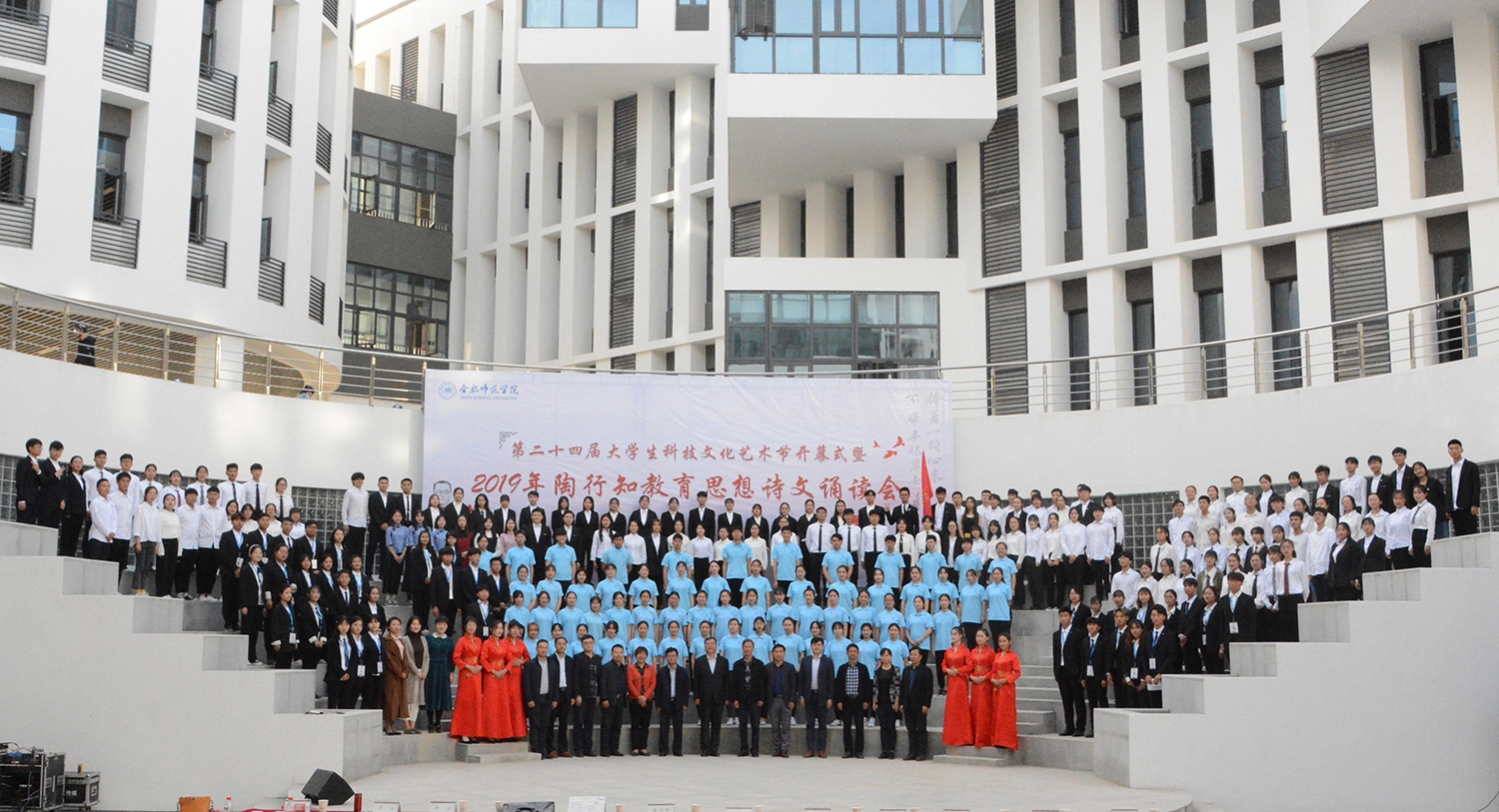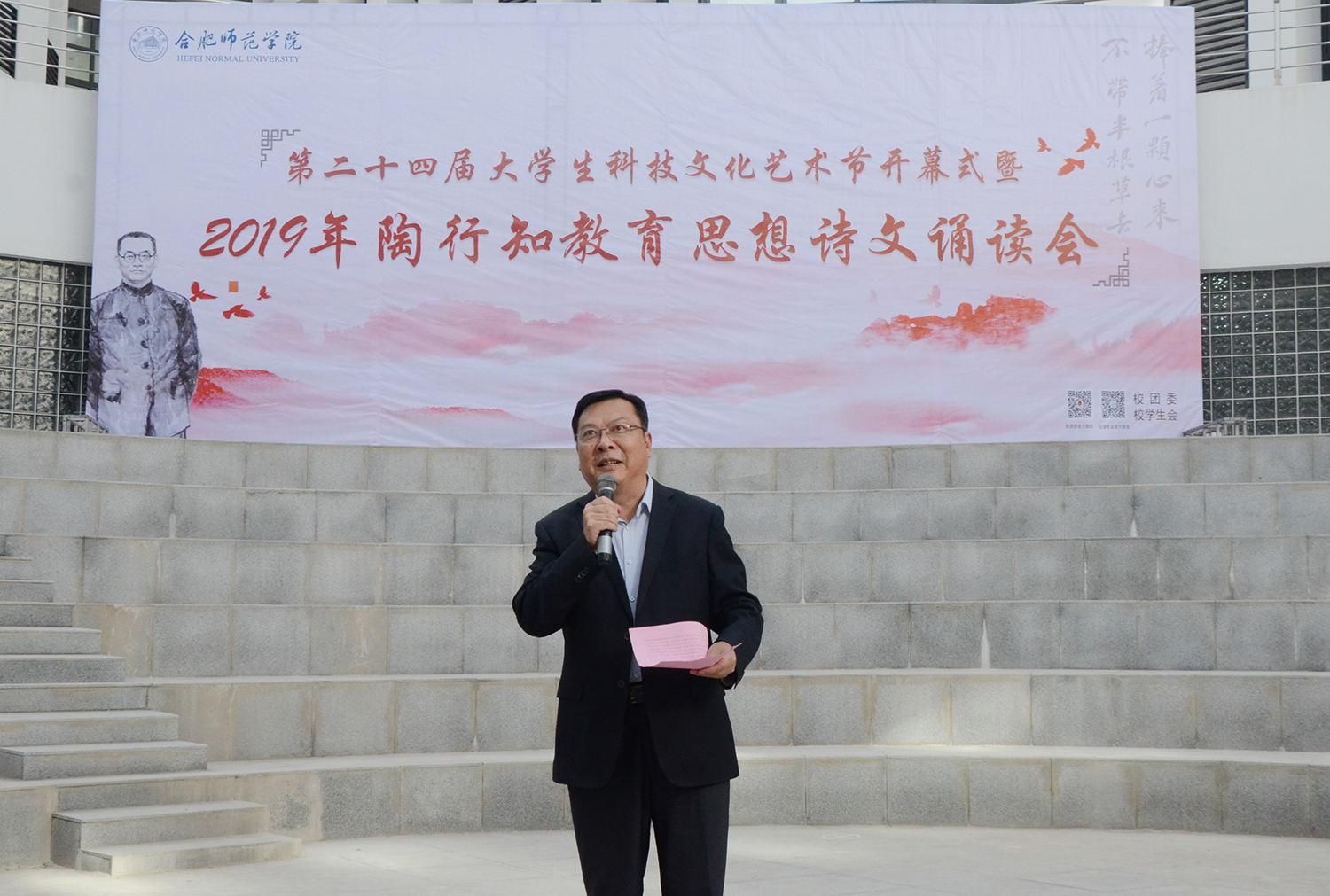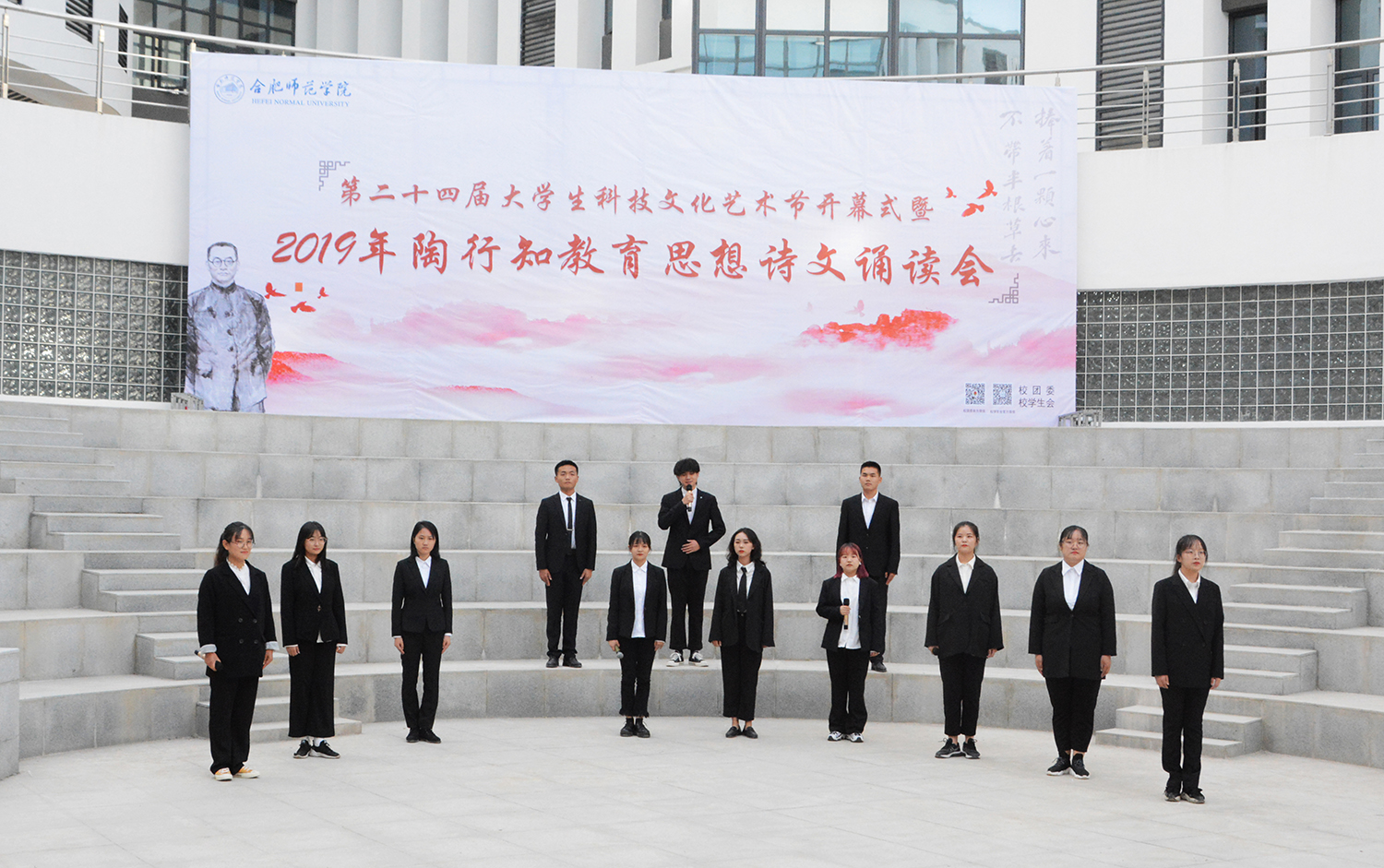 本网讯 10月31日下午,学院第二十四届大学生科技文化艺术节开幕式暨2019年陶行知教育思想诗文诵读会在滨湖校区铭传楼广场举行。院党委书记、安徽省陶行知研究会会长徐成钢,副院长谢阳群,滨湖校区综合管理办公室、后勤处、保卫处、教务处、科研处、宣传部、学工部、团委及相关二级学院负责人,各二级学院分团委书记、辅导员及2019级新生代表参加本次活动。