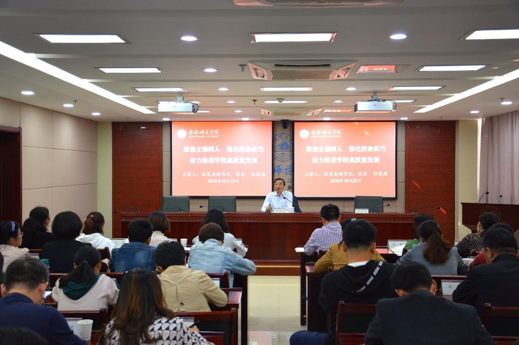 本网讯 10月23日下午,学院在锦绣校区2011会议室举办主题教育科级干部培训班专题辅导报告会,党委副书记、院长孙道胜教授围绕“聚焦立德树人,强化担当作为,奋力推进学校高质量发展”主题作辅导报告,学院全体科级干部参加报告会,报告会由党委委员、组织部部长华银峰主持。