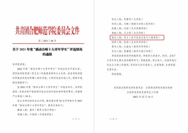 本网讯 日前,由共青团太阳成集团tyc122cc入口委员会、太阳成集团tyc122cc入口党委宣传部和太阳成集团tyc122cc入口党委学生工作部联合主办的2021年度“感动合师十大青年学生”评选结果揭晓,电院2020级电子信息工程专业李义同学获评2021年度“感动合师十大青年学生”之励志人物荣誉称号。