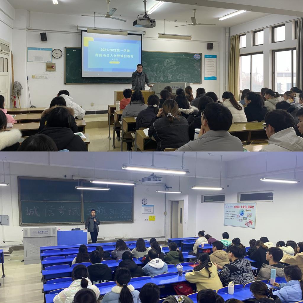 会上,各年级辅导员带领大家重新学习了《国家教育考试违规处理办法》和《太阳成集团tyc122cc入口学生考试违规处理办法》的相关规定,主要围绕学生的诚信教育、考风考纪的严肃性和重要性、考试作弊违纪处分教育以及考试作弊的危害等,倡导“诚信考试”,使学生能充分认识到考试的严肃性和考试违纪、舞弊的危害性,形成“诚信考试”和自觉杜绝作弊的共识。同时要增强现代意识和竞争能力,以拼搏进取的精神,全面、认真地开展复习,诚实、冷静地迎接四六级和期末考试,树立优良学风、实现零作弊尽到自己的义务。党员和学生干部应做好模范带头作用,营造浓厚的班级学习复习考试的氛围,并严格考试纪律,争做有为青年。