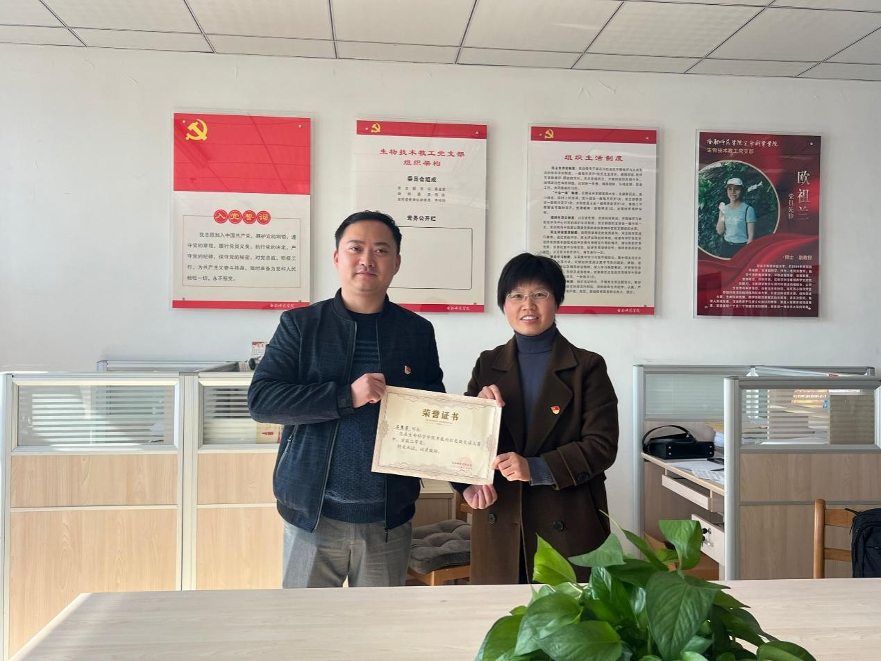活动伊始,生物技术教工党支部书记陈金武向党员教师介绍参赛奖项、获奖教师以及获奖等次,接着为为获奖教师颁发荣誉证书和奖品。