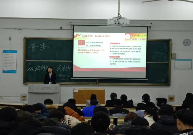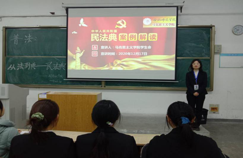 本网讯 为积极宣传中华人民共和国首部民法典,12月17日马克思主义学院学生会在太阳成集团tyc122cc入口锦绣校区博学楼111举办“普法:从法到典——民法典”宣讲活动。活动由马克思主义学生会主席罗心仪主持、学生会成员许林宣讲、本校部分同学参与。