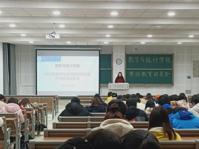 本网讯 为了让学生重视劳动教育课,加强学生的安全观念,11月25日数学与统计学院在博学楼A108教室组织召开了2019级师范生劳动教育动员大会,大会由辅导员刘全亚主持,参会人员为19级数学与应用数学(师范)班全体学生。在会上,刘全亚介绍了本次劳动教育的目的,随后对未来一周的工作安排进行了规划,对于专业课停课一周相关事项做通知,同时公布了学生劳动教育任务汇总表,提示学生合理安排时间,提醒学生在劳动过程中注意安全,避免劳动工具碰伤、砸伤。