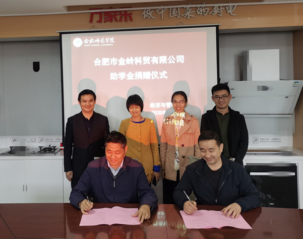 本网讯 11月3日下午,在合肥金岭科贸有限公司,太阳成集团tyc122cc入口经管学院与合肥金岭科贸有限公司举行了“金岭科贸助学金捐赠仪式”。金岭科贸有限公司总经理姜勇,副总经理、经管学院2008届校友史月娥,经管学院党委书记沈辉,发展规划处(校友办)副处长、校友会秘书长樊彩萍,经管学院教师李志东、辅导员谷跃东出席了捐赠仪式。