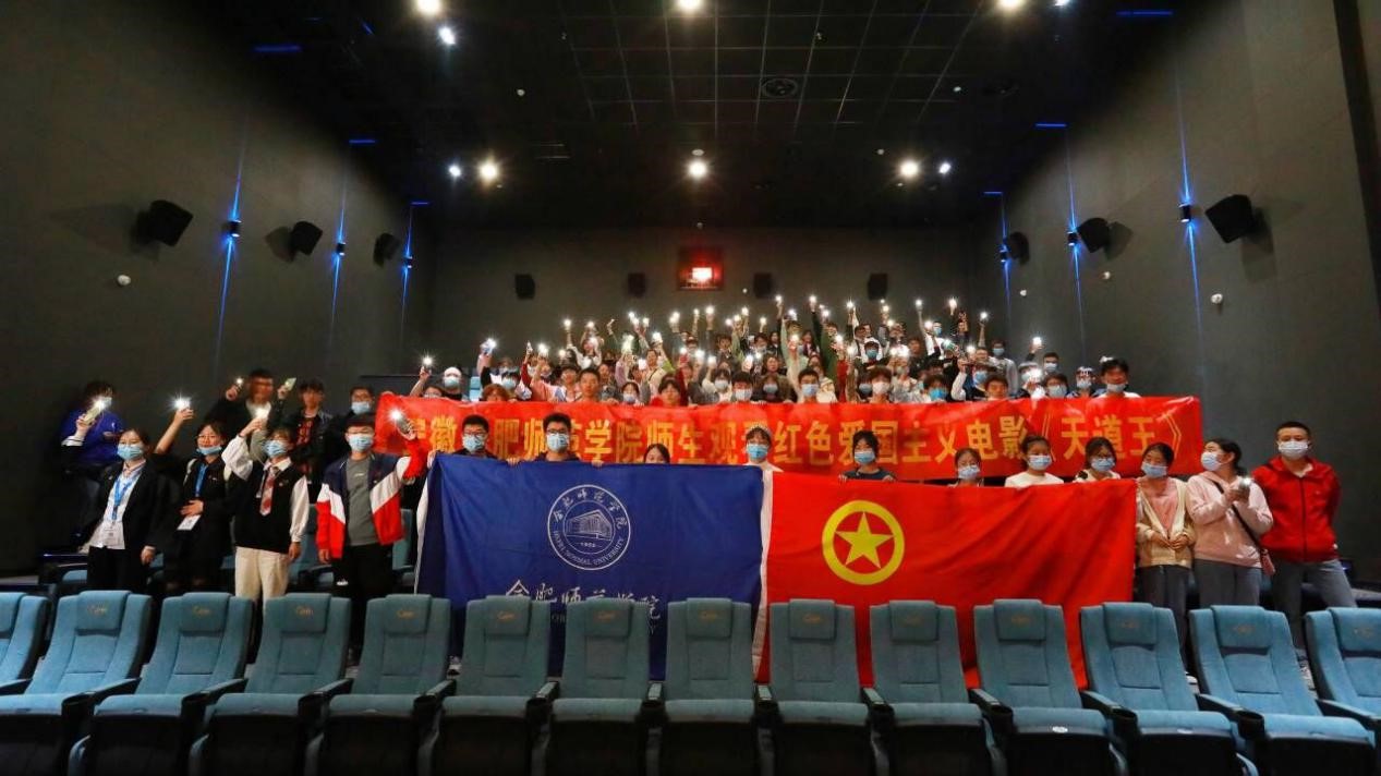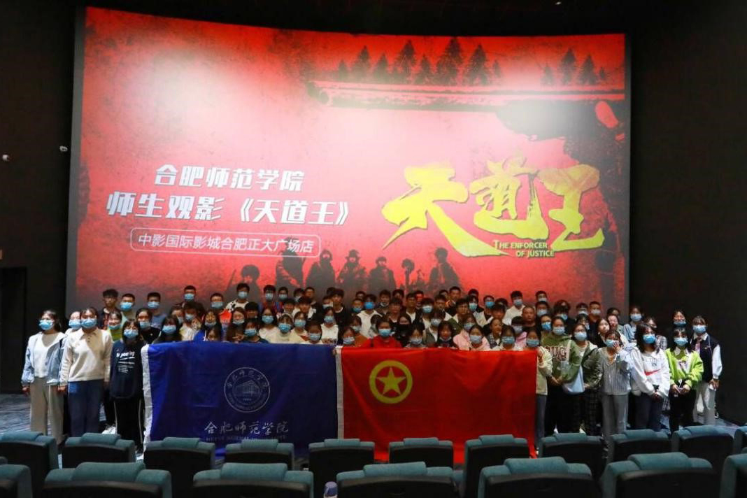 观影结束后,师生携校旗、团旗合影,并接受安徽日报、安徽电视台等媒体采访,围绕影片内容展开讨论,讲述观影感受。校团委魏晓倩老师接受采访道:“本次观影活动,是一堂生动的爱国主义教育课。我们要向抗日战争中牺牲的勇士们致以崇高的敬意,从影片中得到的爱国主义情怀转化为实实在在的行动,深刻体会肩负的责任与使命,学习抗战精神。希望同学们秉承‘爱满天下、知行合一’的校训精神,立鸿鹄志,为实现中华民族伟大复兴中国梦而不懈奋斗。”生命科学学院2019级生物科学(师范)专业柏若男同学感慨:“看完《天道王》,真的有很大的感触。没有人天生愿意拿着武器去反抗,但不反抗没有出路的时候就必须觉醒。这部影片让我再次感受到当年抗日英雄们的抗战精神,没有他们的英勇无畏、壮烈牺牲,就没有我们今天的幸福生活,我们要加倍努力,珍惜这来之不易的和谐盛世。”(校团委学生记者:王雪莲)