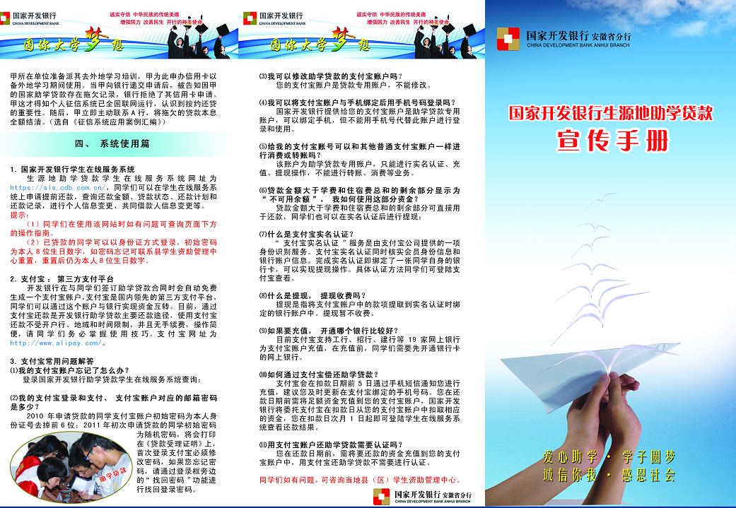 二是上好资助政策两节课。学院各班级组织同学们观看了影片和助学贷款宣传手册,同时还学习了人行个人征信知识介绍以及助学贷款的相关注意事项。希望同学们在学习的过程中能感悟到国家对他们的关心和支持,同时也希望同学们能感受到国家对他们的关心,继而努力学习,回报社会。