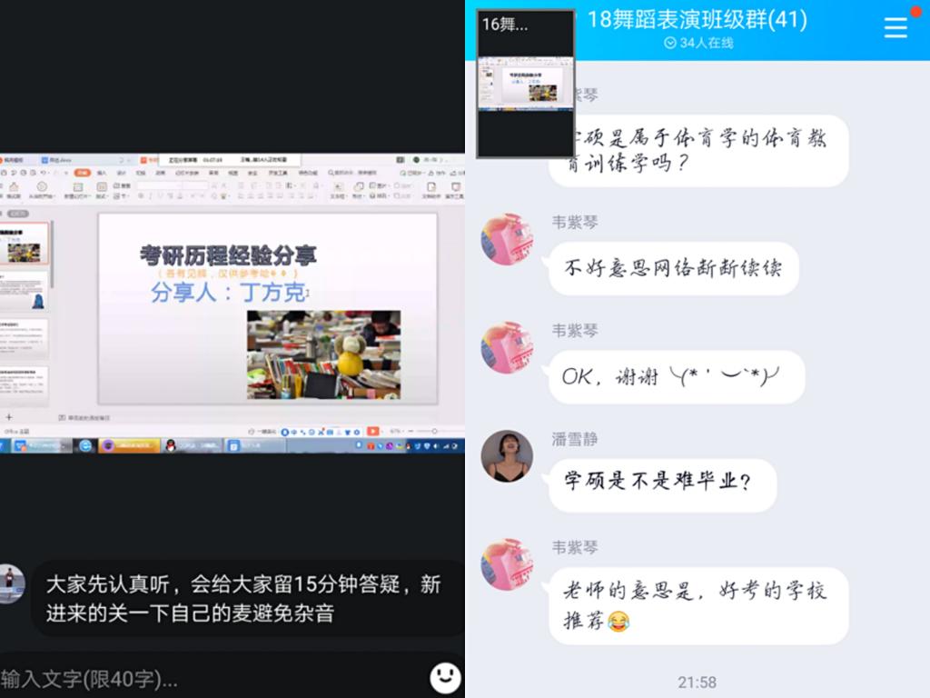 二是举办线上励志报告会。结合国家励志奖学金和助学金评选选树学生励志典型,体育科学学院辅导员邀请了2018-2019学年国家励志奖学金获奖学生2016级舞蹈表演专业丁方克给同学们做了线上励志报告,报告内容包括考研经验以及专业学习生活分享等,着力用同学们的身边人身边事教育引导学生自立自信自强。