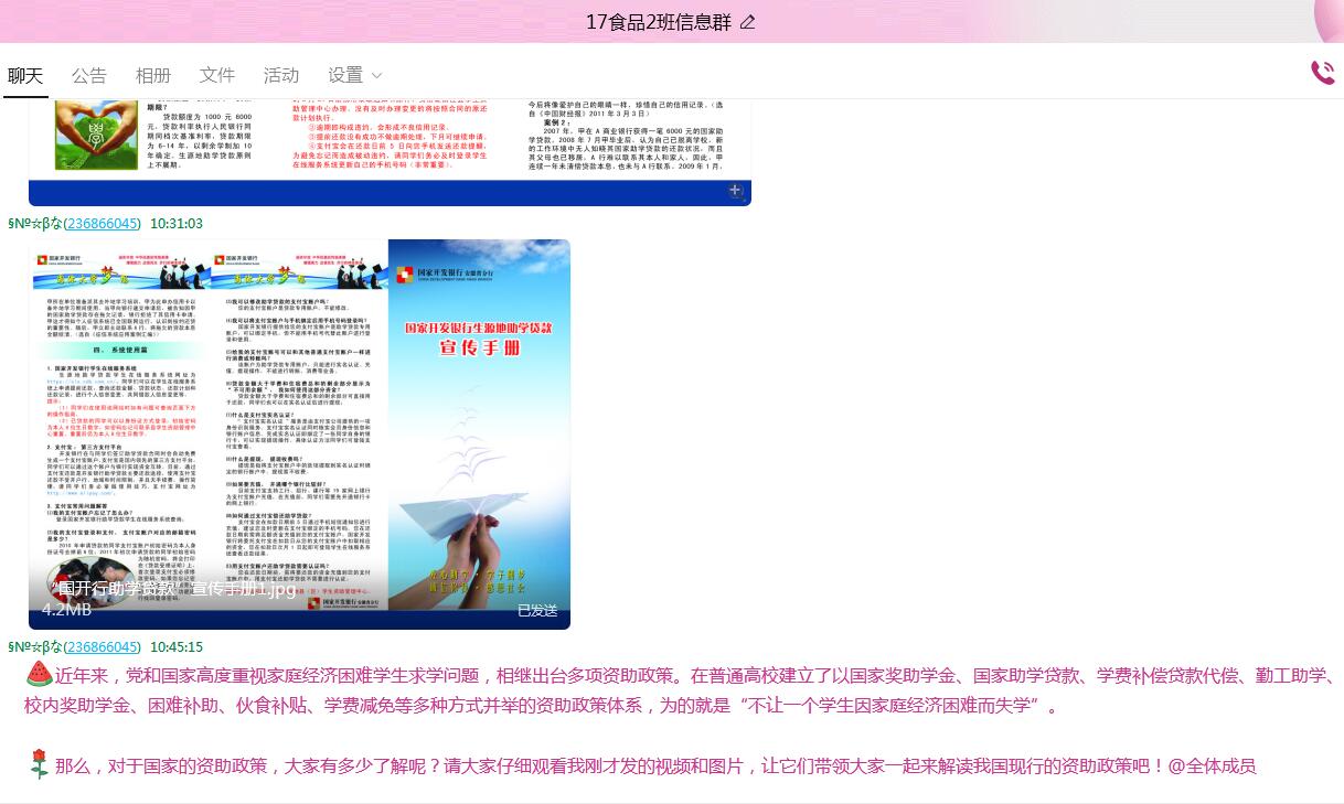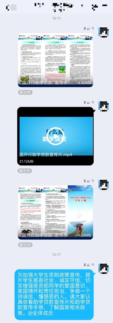 二是观看影片及发放宣传手册。生命科学学院各个年级辅导员分别将助学贷款宣传片、宣传手册ppt线上发放给学生,让学生更加熟悉贷款流程。