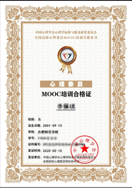 本次培训采用M00C形式,在“全国高校心理委员工作平台”微信公众号平台上进行。培训课程包括“大学生心理危机的预防和干预”、“如何面对宿舍关系”、“情绪管理”等14个专题视频,每个专题视频学习结束后需进行专题测试,完成配套试题且测试总分达到85分则视为认证通过。认证通过后可获得由中国心理学会心理学标准与服务研究委员等单位颁发的电子证书。培训过程中,心理委员们积极参与,认真听讲,以优异的成绩完成考核认证。
