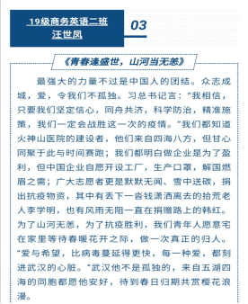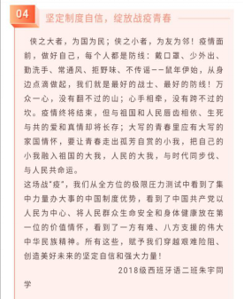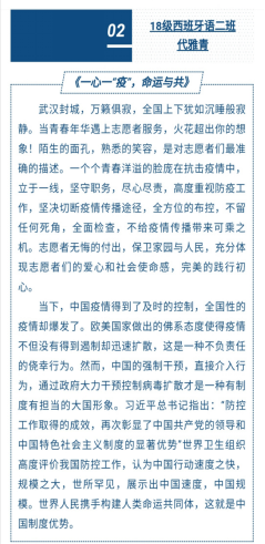 青春本色向阳,我们在战“疫”中洗礼、在战“疫”中成长。珍惜韶华,奋发有为,在为祖国与人民的奉献中成长,谱写当代青年的光荣和责任。(外国语学院:杜茜茹 苏珊)