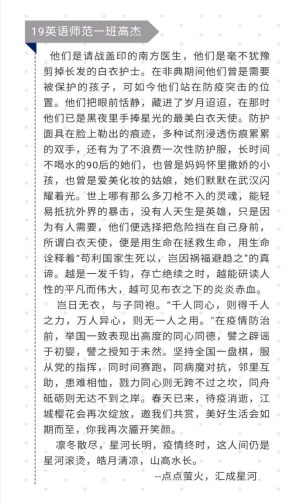 汪世凤同学写道:“他们在“以人为本”这条路上一直不忘初心、牢记使命。甚至有一种来自心底的感觉:中国在,我就安心;在中国,就是幸福。”深刻表达了我们对党和国家的信任。同时关于奔赴在前线的英雄们代雅青同学写道:“在公与私的天平上,你们毅然选择坚守防控一线。这就是一名普通基层医护人员,用自己的行动诠释初心与使命,用自己的付出彰显责任与担当。”体现出对前线医护人员的赞美与敬佩。