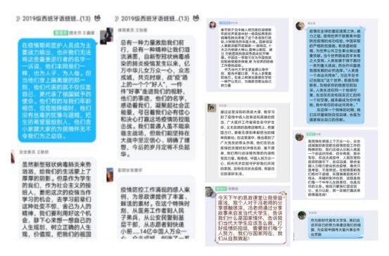 2017级英语(师范)三班的庞冬雪说:“他们逆行而上,奔向疫情最前线;他们坚守岗位,用血肉之躯尽绵薄之力支援同胞;他们挑灯夜战,用“中国速度”与疫情奔跑。无数的“追光者”们在国家和人民最需要的时候,做出无怨无悔的选择。他们把对人民的爱,对祖国的爱放在心底,用一个个鲜红而又坚定的手印,表达着火热的担当与承诺;他们用最美的身影,诠释了生命的意义;他们用坚守的背影,演绎着泱泱大国的生生不息;他们用自己的行动,书写着人生最精彩最壮丽的韶华篇章!”