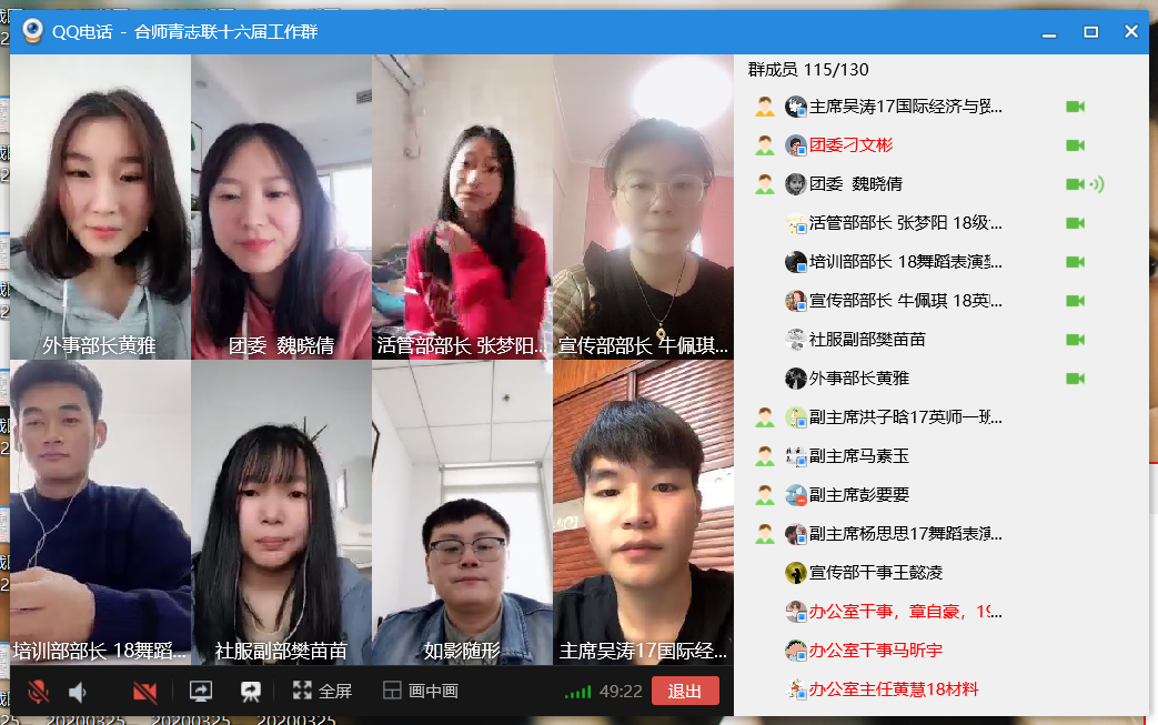 本网讯 3月25日中午,青年志愿者联合会在线上召开2020年第一次全委会暨新学期工作部署会议。院团委副书记刁文彬,青年志愿者联合会第十六届全体成员参加会议。青年志愿者联合会指导教师、院团委组织发展部魏晓倩主持会议。