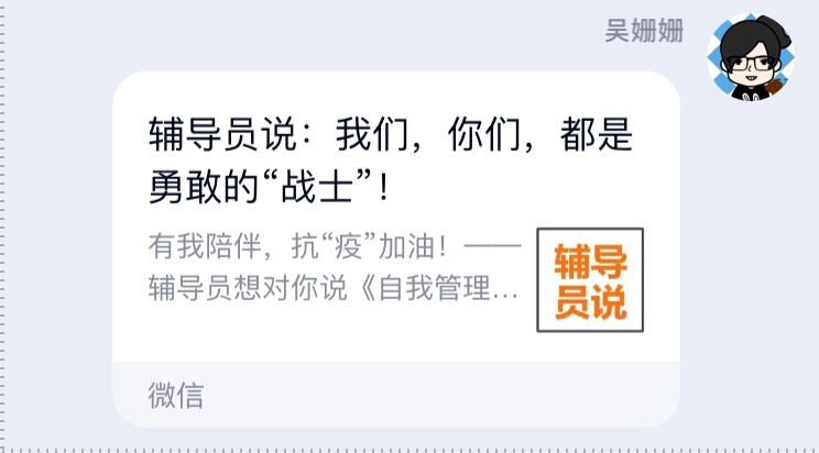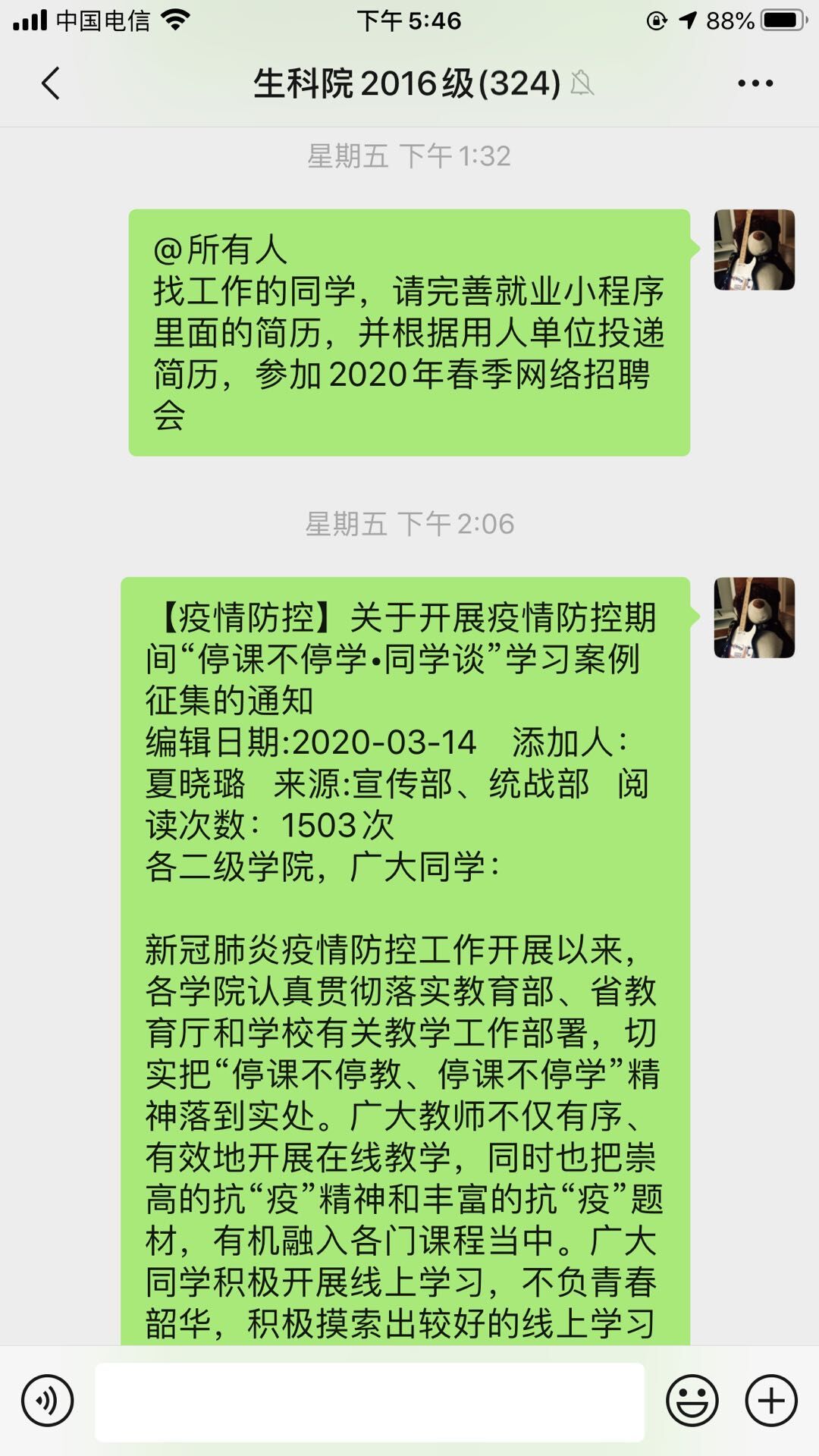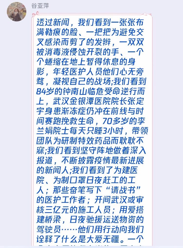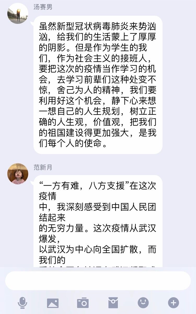 各班同学们也纷纷在线上踊跃发言,交流家乡疫情防控的形势和自己“宅”家抗疫的感受,分享身边抗疫的感人事迹,大家众志成城共克时艰,希望疫情早些结束,尽快重返校园,开始生机蓬勃的新学期!(生命科学学院:吴姗姗)