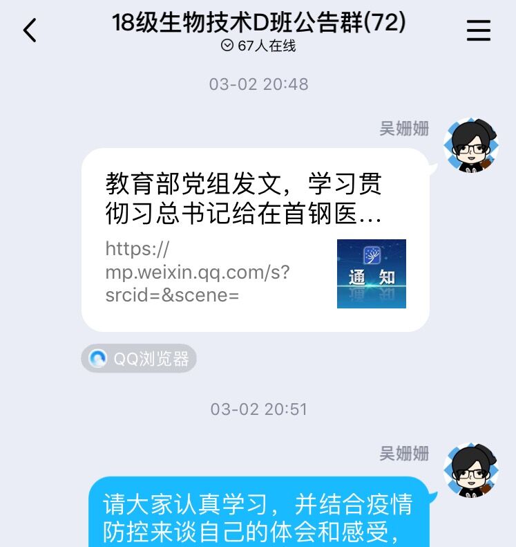 本网讯 为深入贯彻习近平总书记关于疫情防控工作的重要讲话精神,加强疫情防控期间学生日常思想政治教育和管理工作,同时为了响应落实学校应对疫情防控工作要求。连日来,生命科学学院辅导员通过QQ、微信等线上平台召开“众志成城共克时艰,坚守使命服务青年”主题班会,做到“停课不停育”,做实做细学生工作。