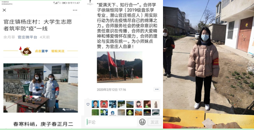 在这次疫情防控阻击战中,17级音乐表演班的学习委员张秀颖也贡献了自己小小的力量,她在老家六安市裕安区独山镇独山村乡村委会从事志愿服务工作,主要负责在道路交界处分发防疫口罩,监督和审查过往人员的身份等等。从这次疫情中,她呼吁大家爱护野生动物,保护大自然,敬畏生命,从我做起。张秀颖同学说:“我始终相信在党中央的领导下,全国上下齐心协力,众志成城,一定会打赢这场没有硝烟的战争。志愿服务不仅是对自我的督促,还是一种用自己微小的贡献来回馈社会,奉献祖国!”