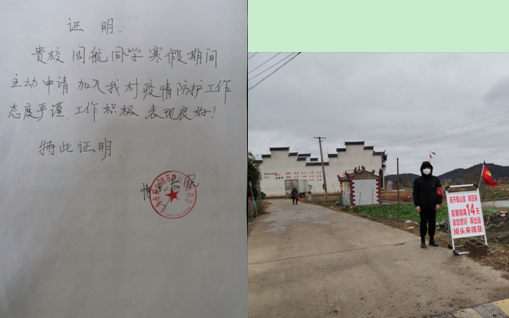 2019级音乐表演一班的李蔚然是合大学生艺术团外联部的一名干事,寒假回老家自愿报名参加前梁村大学生志愿者参与疫情防控工作的活动,进行社区疫情防控知识宣传、疫情联防联控、检测登记往返外来人员、排查疫区返回人员等防疫工作,积极承担社区“宣传员”的责任,凝聚青春正能量,发扬模范先锋作用。她说:“即使在基层,我也感受到了疫情的严峻和国家对疫情防控的重视。”