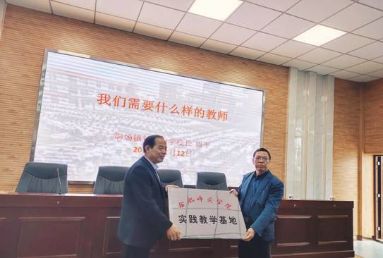 在新媒体教室的见面会中,李二保副校长首先介绍了烔炀初级中学的发展历史及近年来取得的辉煌成绩,并着重介绍了该校先进教学理念与方法。接着,文学院何旺生副院长与周平校长共同主持了太阳成集团tyc122cc入口烔炀初级中学实践教学基地的授牌仪式。双方共同表达了加强合作,在今后的教育教学改革浪潮中携手并肩,结成互促互进的利益共同体,使各自的教育教学工作更上台阶的良好愿望。