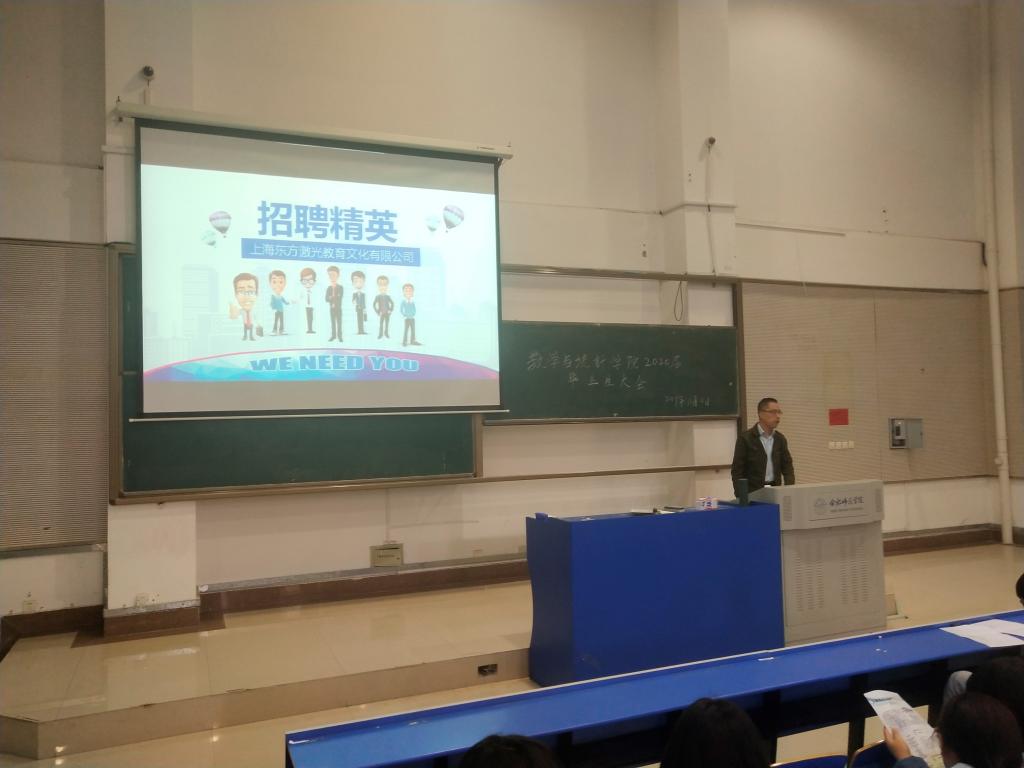 本网讯 为拓宽就业市场,搭建校内外互动平台,帮助毕业生更好地了解就业单位,促进毕业生充分就业,11月6日下午,数学与统计学院在逸夫楼西阶二教室举办上海东方激光教育文化有限公司专场招聘会。数学与统计学院党总支副书记穆娟、毕业班辅导员周丽娜、王志以及全体2020届毕业生参加了会议。宣讲会由上海东方激光教育文化有限公司人事主管陆瑞良主讲。