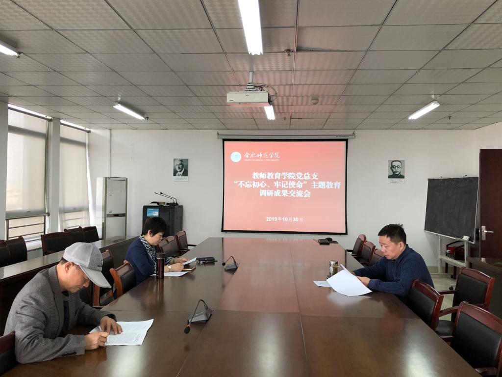 本网讯 10月30日下午,教师教育学院在行知楼710会议室召开“不忘初心、牢记使命”主题教育调研成果交流会,党总支副书记王东明主持会议。党总支副书记、院长李群,副院长闫龙参加会议。