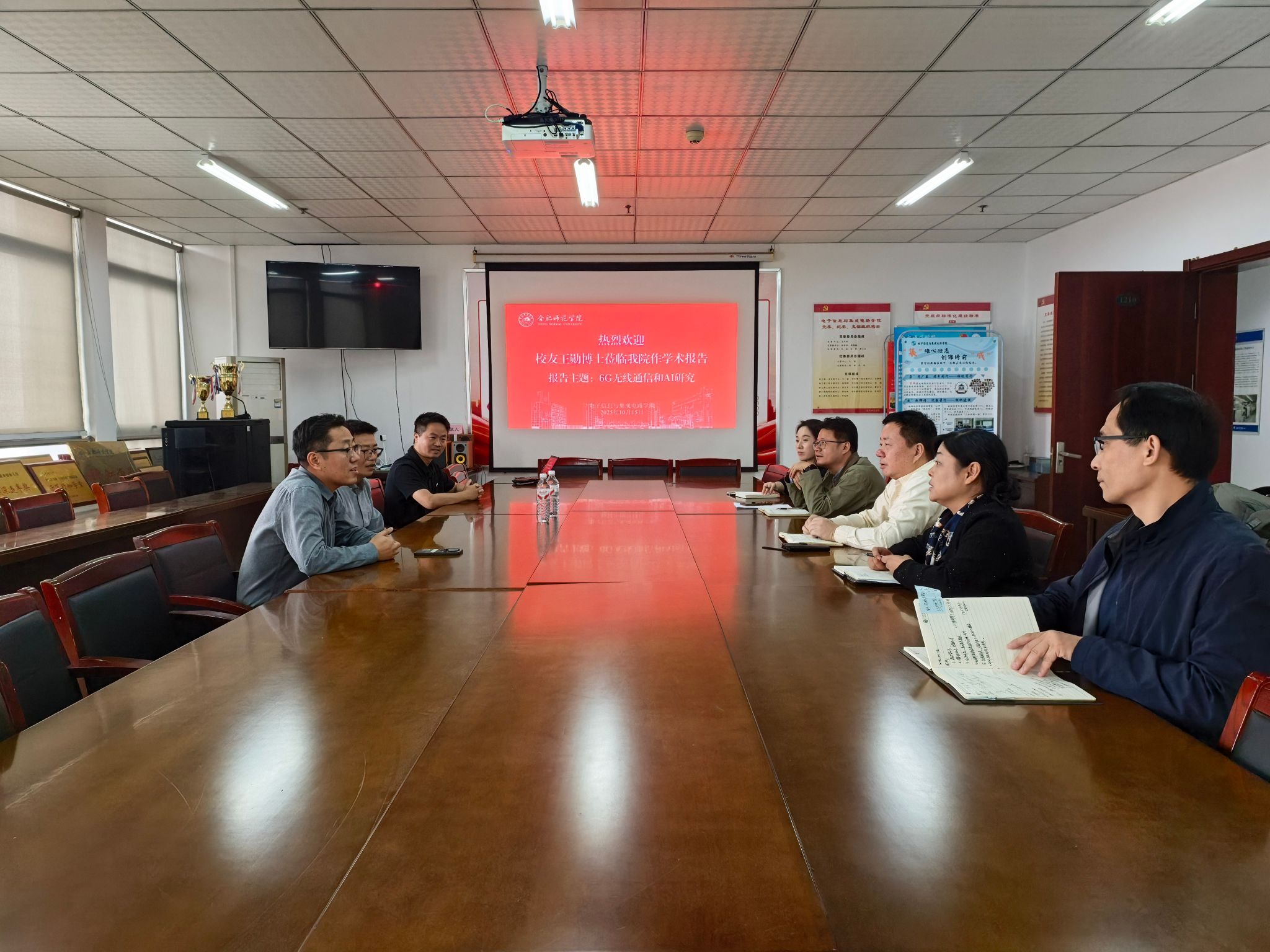 在锦绣校区,王勋校友与学院教师代表齐聚会议室展开学术研讨。王勋博士系统汇报了其在“下一代无线通信网络与 AI 融合技术”领域的研究方向与最新成果,详细阐述了技术瓶颈突破路径与应用前景。