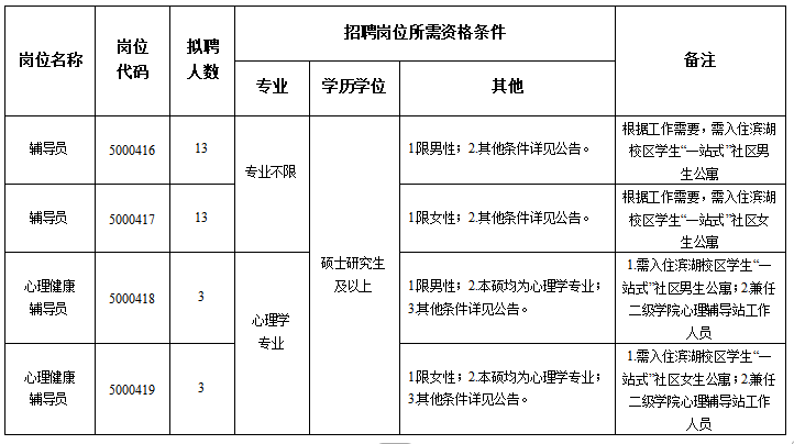 (三)具有较强的学生工作综合素质,应聘者须在本科或研究生学习期间担任班长,团支部书记,学生会主席、副主席及其他重要学生工作组织的主要负责人一年以上或具有高校工作经历,在校学生在读期间参加勤工俭学、实习等不视为工作经历。