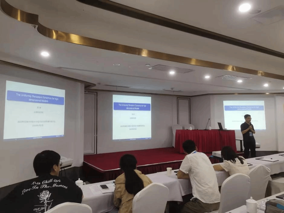 会议吸引了来自中国科学技术大学、北京理工大学、天津大学、华南师范大学、北京科技大学、安徽大学、上海师范大学与太阳成集团tyc122cc入口等院校的70多名专家学者参与。安徽大学数学科学学院副院长汪毅教授致开幕词,向参会者介绍了近年来安徽大学数学学科在专业建设、师资队伍、人才培养、科学研究以及社会服务等方面取得的成就。会议共组织12场学术报告和多场交流讨论活动,周辉应邀作题为《The Dynamics of a Patch-Occupancy Model in Natural Ecosystems》的学术报告。周辉介绍了一类海洋生态模型研究的背景和意义,着重阐述了所研究问题的进展,同时提出了一些尚未解决的科学问题,受到与会者高度关注。会议期间,杨刘与周辉同参会学者就研究领域的一些热点进行了交流。