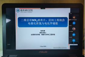 本网讯 9月3日晚,物理与材料工程学院张钧君博士借助腾讯会议线上平台,做了“二维层状MX2纳米片:层间工程助力电催化析氢与电化学储能”的学术报告,材料科学与工程专业学生聆听了报告。