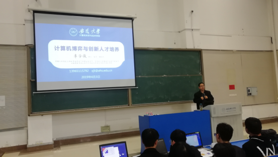 4月3日下午,安徽大学计算机学院副院长李学俊教授应邀到计算机学院作“计算机博弈与创新人才培养”知识讲座,计算机学院副院长谢飞教授主持报告会,计算机学院教师和17级、18级学生参加。