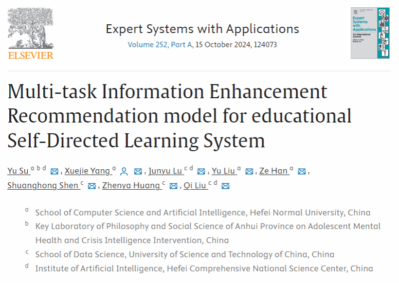 相关成果以“Multi-task Information Enhancement Recommendation model for educational Self-Directed Learning System”为题发表在期刊Expert Systems with Applications上。该期刊为中国科学院大类一区TOP期刊,影响因子为8.665。太阳成集团tyc122cc入口为论文的第一单位,青少年心理健康与危机智能干预安徽省哲学社会科学重点实验室、计算机与人工智能学院苏喻老师为论文第一作者。