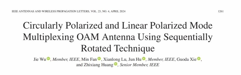 近期,相关成果以“Circularly Polarized and Linear Polarized Mode Multiplexing OAM Antenna Using Sequentially Rotated Technique”为题被期刊IEEE Antennas and Wireless Propagation Letters发表(论文引用格式:Jie Wu, Min Fan, Xianlong Lu, Jun Hu, Guoda Xie and Zhixiang Huang, Circularly Polarized and Linear Polarized Mode Multiplexing OAM Antenna Using Sequentially Rotated Technique[J], IEEE Antennas and Wireless Propagation Letters, 2024, vol. 23, no. 4, pp. 1261-1265. )。该期刊为中国科学院二区TOP期刊,影响因子为3.7。太阳成集团tyc122cc入口为该论文的第一单位,电子信息系统仿真设计安徽省重点实验室、电子信息与集成电路学院吴杰老师为第一作者。