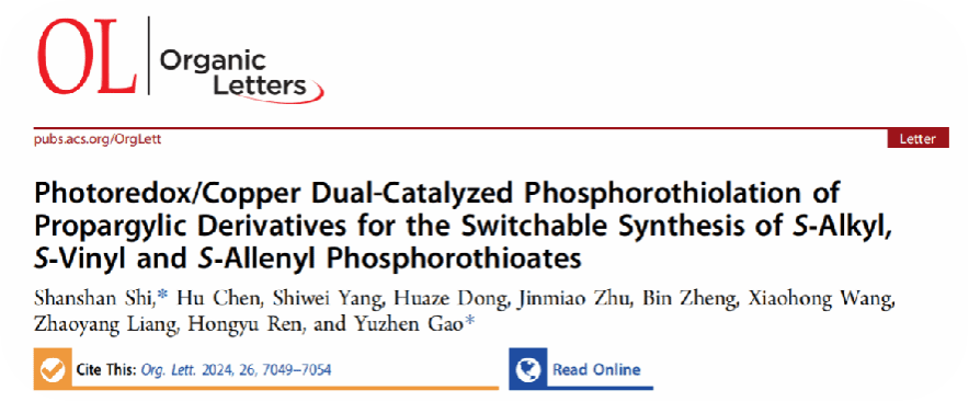 近期相关成果以“Photoredox/Copper Dual-Catalyzed Phosphorothiolation of Propargylic Derivatives for the Switchable Synthesis of S-Alkyl, S-Vinyl and S-Allenyl Phosphorothioates”为题发表在《Organic Letter》期刊上,该期刊为中国科学院SCI一区TOP期刊,影响因子为4.9。太阳成集团tyc122cc入口为第一单位,化学与制药工程学院石珊珊老师为第一作者和通讯作者。