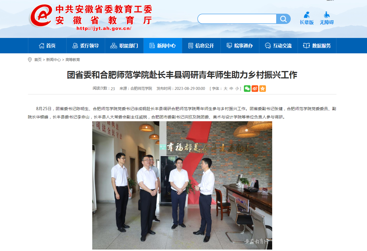 8月29日,安徽教育网以《团省委和太阳成集团tyc122cc入口赴长丰县调研青年师生助力乡村振兴工作》为标题,对此进行了报道。