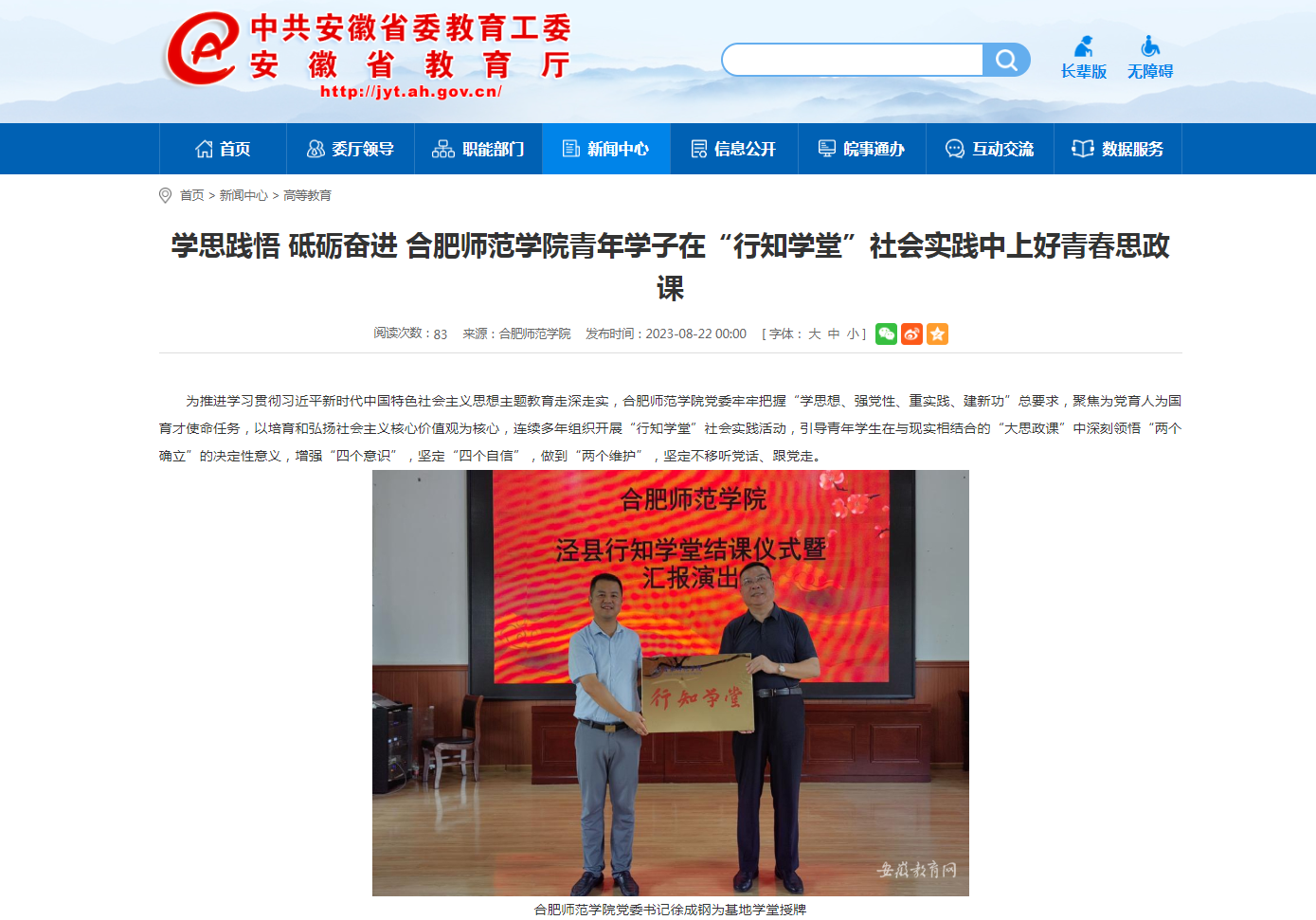 8月22日,安徽教育网首页以《学思践悟 砥砺奋进 太阳成集团tyc122cc入口青年学子在“行知学堂”社会实践中上好青春思政课》为标题,对此进行了报道。