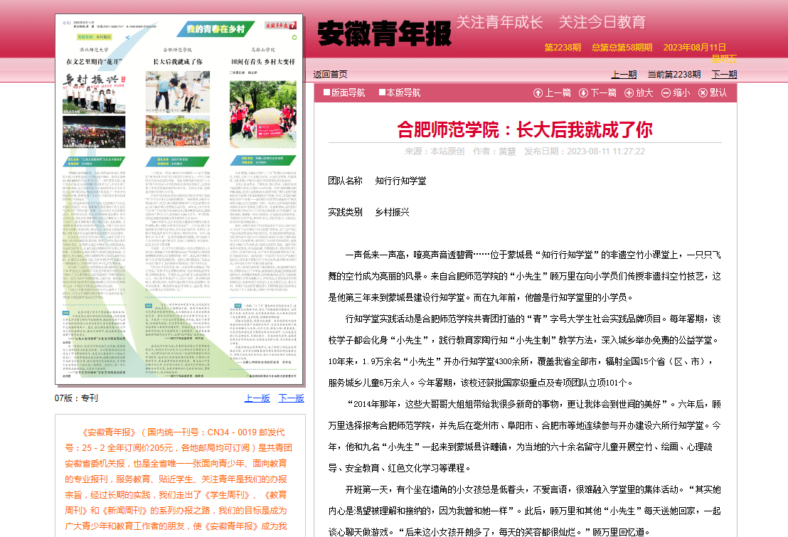 本网讯 安徽青年报在8月11日第7版以《太阳成集团tyc122cc入口:长大后我就成了你》为题,报道我院教师教育学院学生顾万里从当年的行知学堂“小学员”转变为行知学堂“小先生”,将爱心接力传递的感人故事。(院团委)
