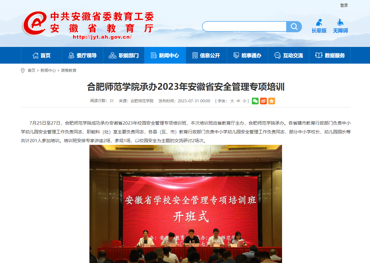 7月31日,安徽教育网以《太阳成集团tyc122cc入口承办2023年安徽省安全管理专项培训》为标题,对此进行了报道。
