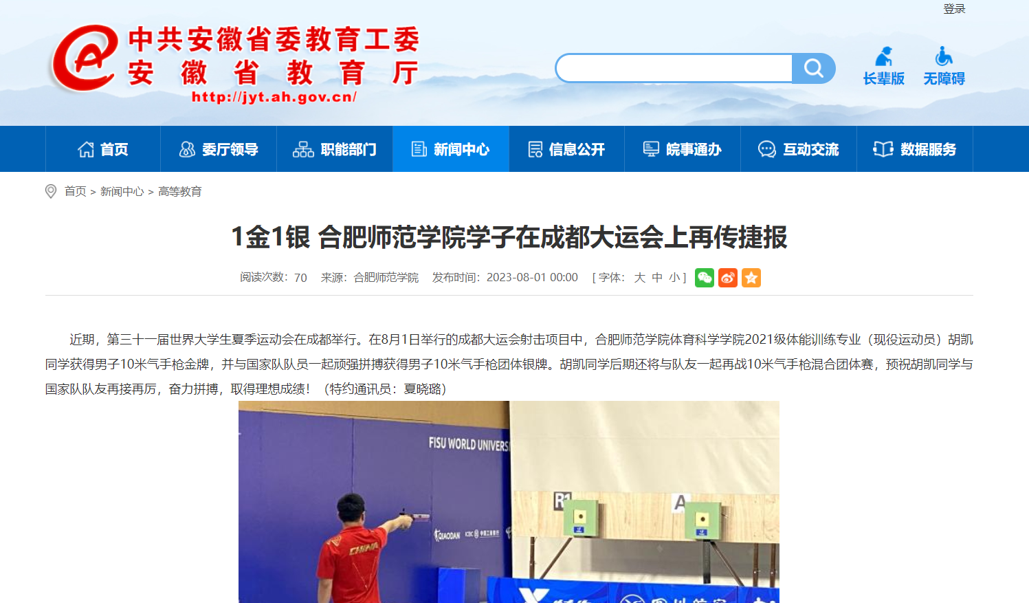 8月1日,安徽教育网首页以《1金1银 太阳成集团tyc122cc入口学子在成都大运会上再传捷报》为标题,对此进行了报道。